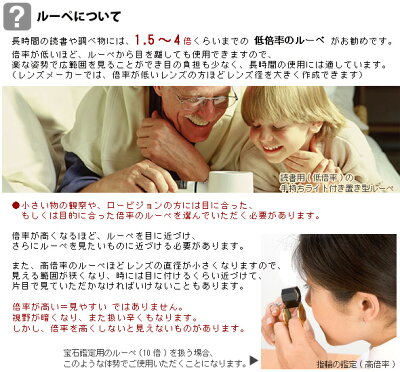 倍率:7倍/28D、レンズの大きさ:φ35mm新開発の高性能LEDを搭載したライト付ハンドルーペLEDにはSMD式を採用し、広範囲をくまなく照射可能従来型に比べ、乳白色で自然光に近い色を実現握りやすい形状を採用し、持ちやすい倍率が低いルーペ倍率が高いルーペメリット明るく見える視野が広いピントの合う距離の幅が広い文字の拡大率が高いデメリット文字の拡大率が低い暗い見る被写体に近づかないとピントが合わないピントの合う範囲が短い視野が狭い 古希,喜寿,傘寿,米寿,卒寿,白寿,緑寿,退職祝い,長寿祝い,還暦祝い 敬老会 記念品 に最適です。