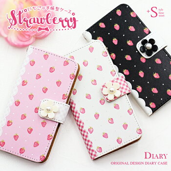 お花のデコパーツがアクセントのキュートないちご柄の 手帳型 ダイアリーケース。